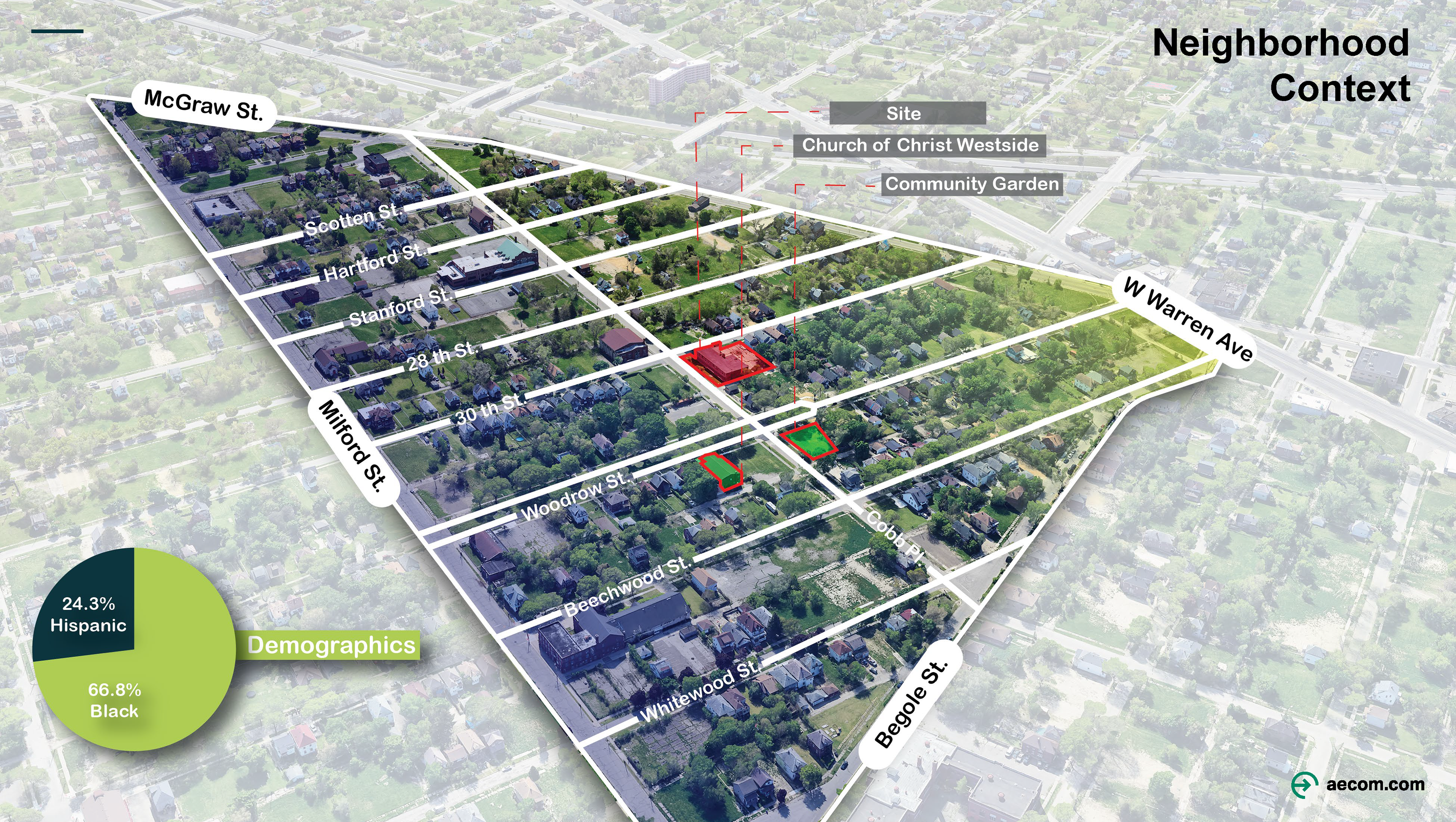The Midwest-Tireman neighborhood has a predominantly Black population, making up 66.8% of residents, with Hispanics accounting for 24.3%. The clients also own the adjacent Church of Christ Westside, along with a community garden located one street west of the project site.